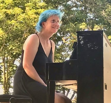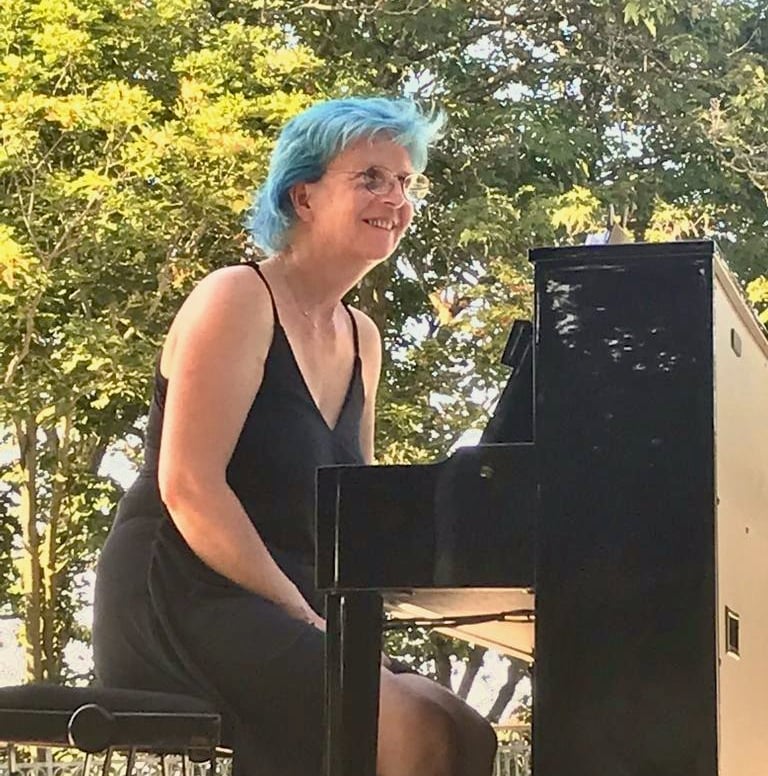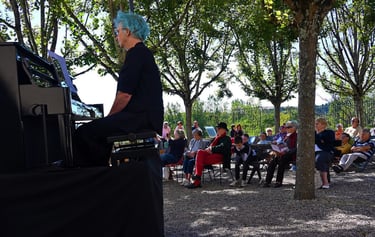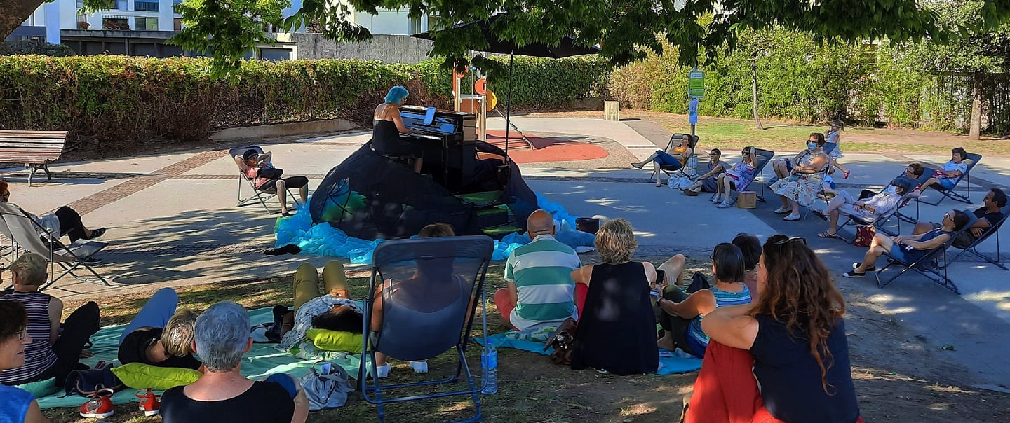 L’envie de partager son plaisir de jouer dans des espaces ouverts (ou bleus) et devant des publics divers (et d'été) lui donne l’idée de créer une scène tractable sur laquelle elle installe son piano.